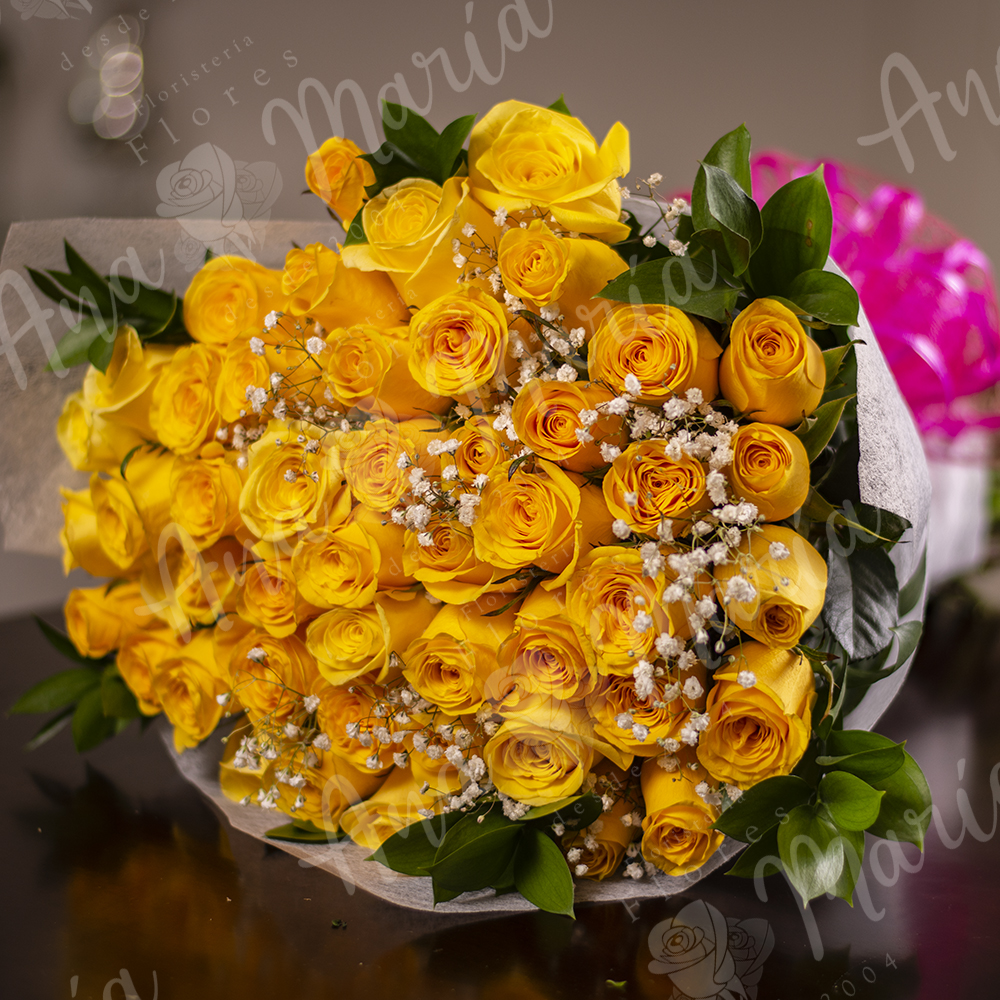 Tierno bouquet de rosas amarillas 72 unds con variedad de follajes decoración con delicado empaque.