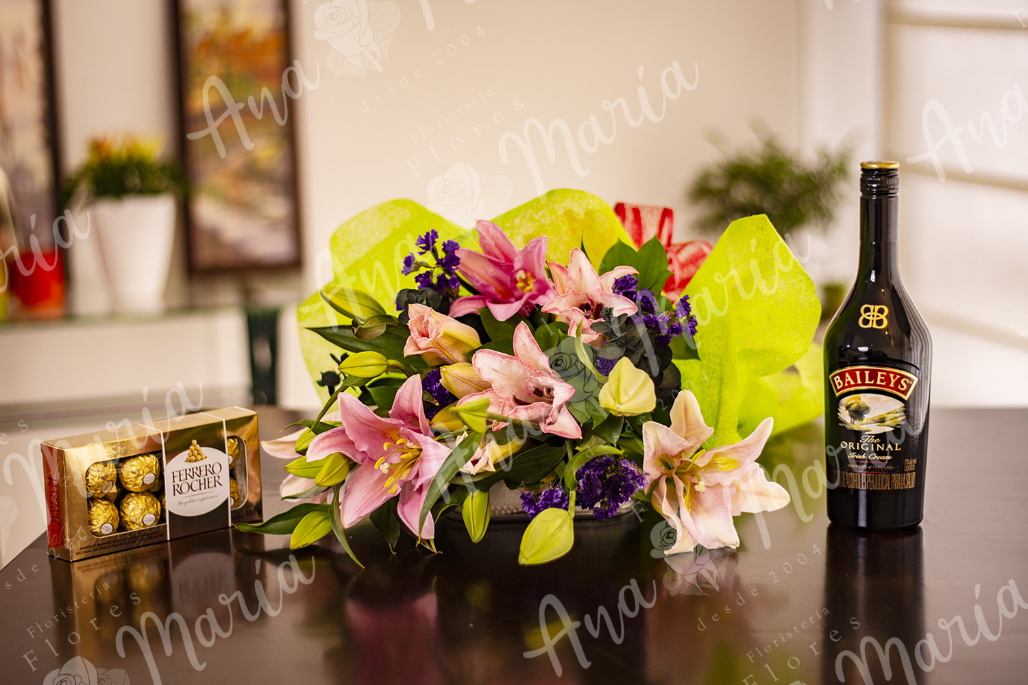 Delicado bouquet elaborado con 5 tallos lirios, delicado follaje y empaque. Incluye botella de 700 ml de Baileys y chocolates ferrero roche x 8 unds