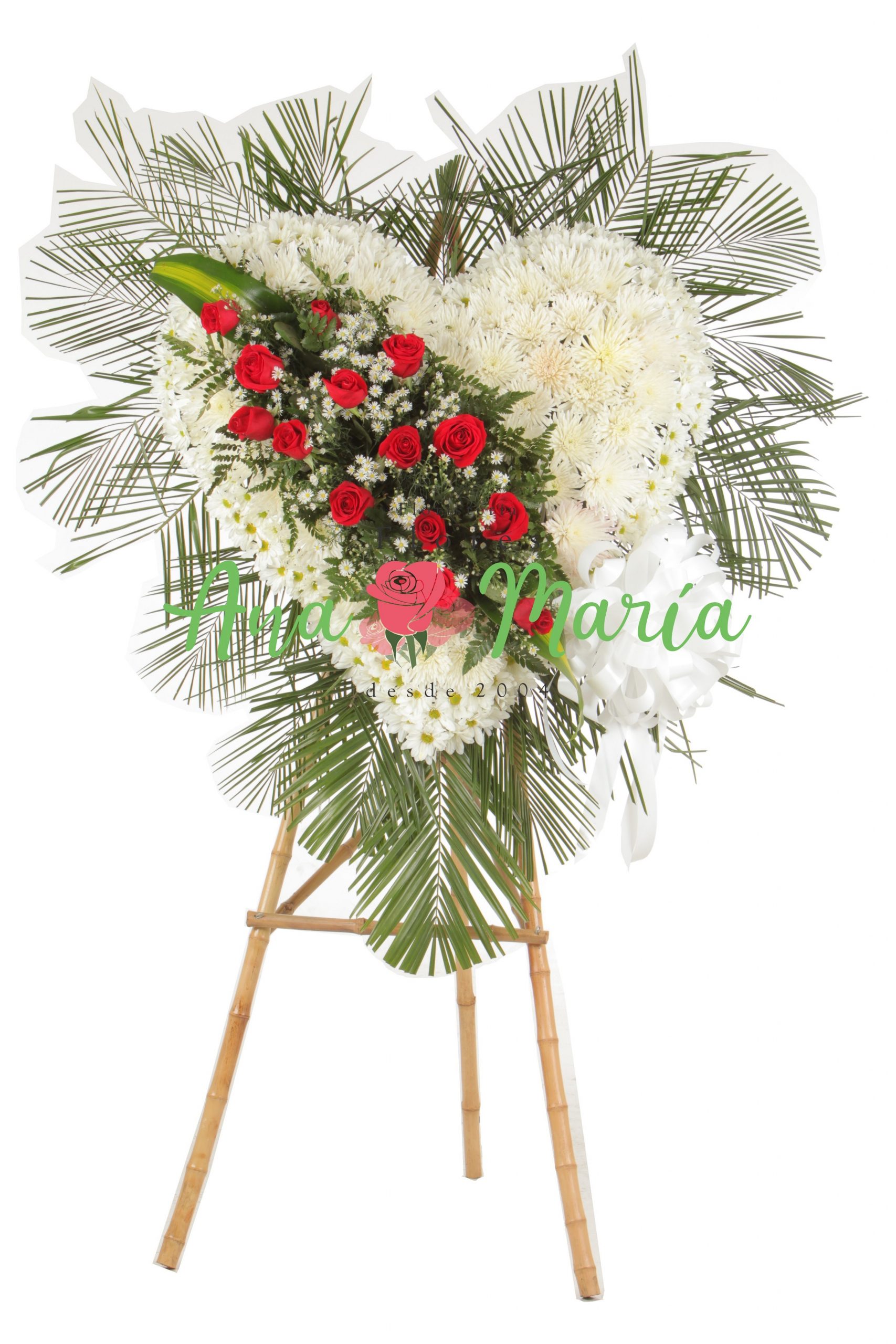 Delicada corona fúnebre elaborada con margaritas, pompones,  rosas rojas y  variedad de follajes en laborado en un pedestal o trípode.