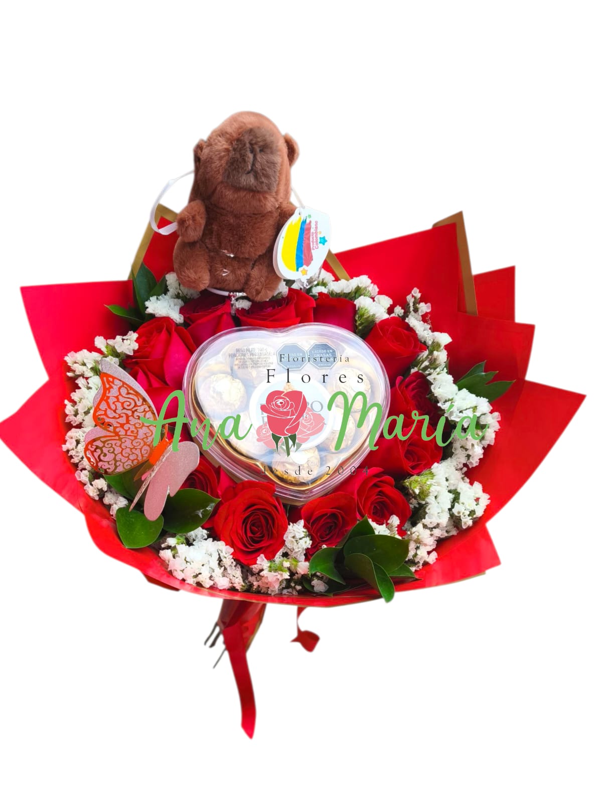 Tarjeta, caja de Ferrero roche x 8 und, corazon de chocolates ferrero y peluche pequeño